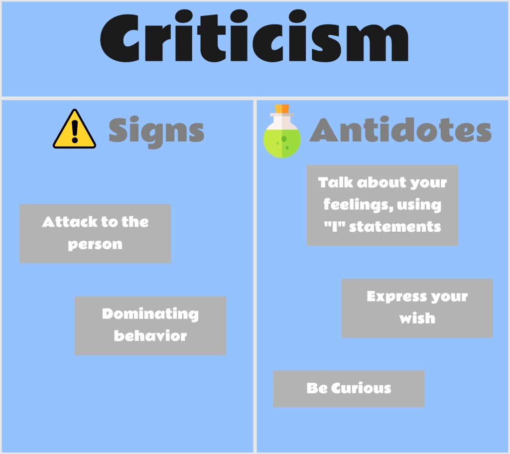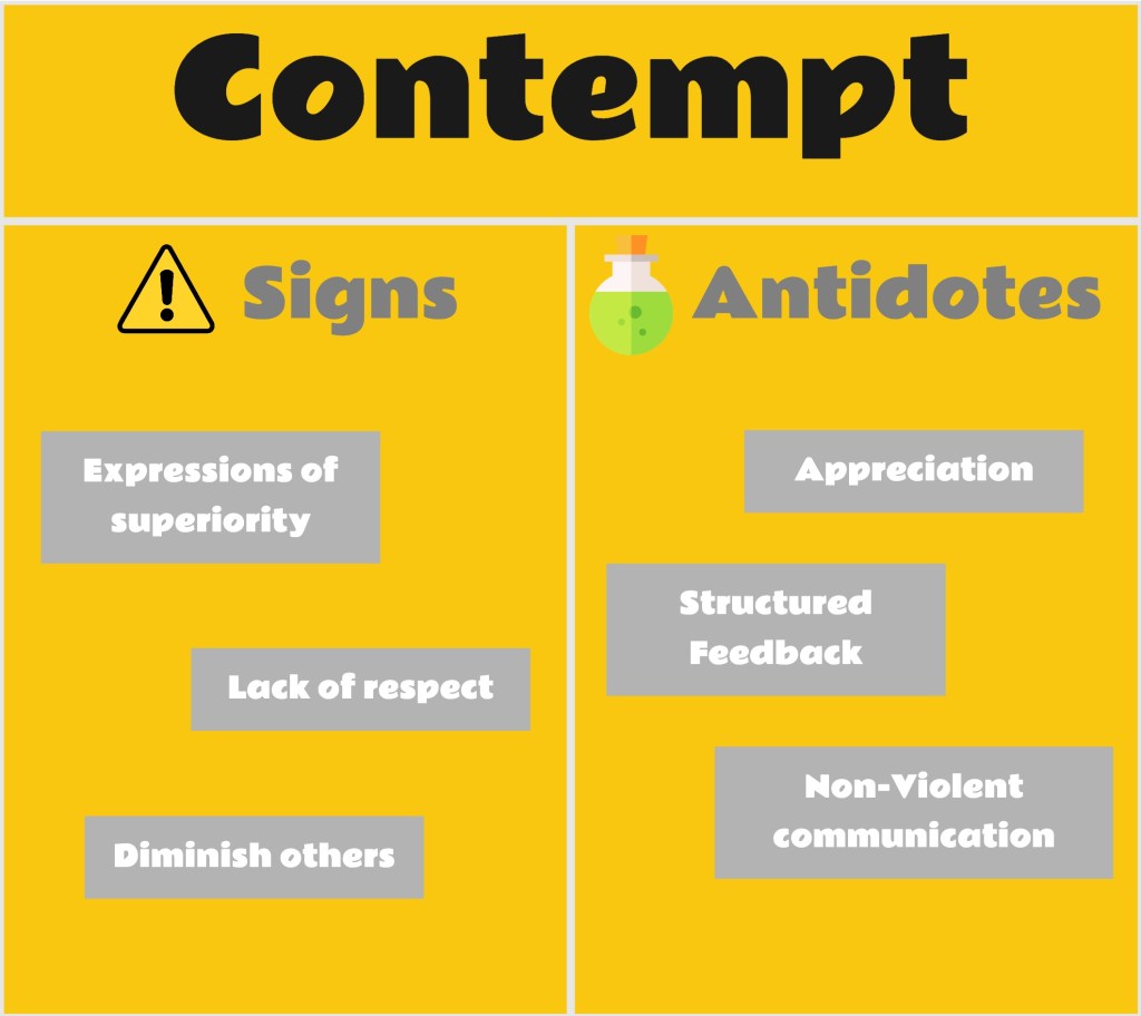 We all use to trigger at least one of the four destructive behaviors. An interesting exercise is to do a self-reflection and pick the one that you think you use the most. Then, without sharing your selection, share the four behaviors with someone and ask for feedback. Did you see yourself in the same way others see you? Being aware of it, will already be an important first step.