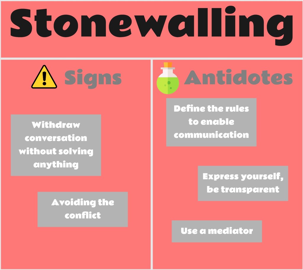 Stonewalling occurs when the conversation is unfinished or when there is no progress towards a resolution. To prevent it, define the rules that can help you express yourself, what is it that you need to be transparent? if you don’t think you can do it, you can get a mediator too.